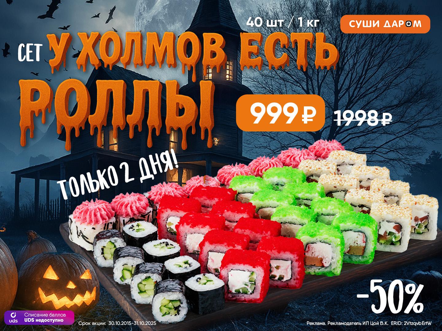 Когда за окном воет ветер, а тени танцуют по стенам, в самое время призвать что-то по-настоящему… вкусное [emoji=:orange_heart:][br][br] Сет “У Холмов Есть Роллы” — 1 кг за 999₽![br][br]Не ищи спасения — просто возьми палочки и попробуй вкус, который пробуждает даже спящих монстров [br][br][emoji=:100:]Свежие ингредиенты, идеальная подача и атмосфера, в которой ужин превращается в настоящее хэллоуинское приключение [br][emoji=:collision:] Пока другие боятся темноты — ты наслаждаешься ею.[br][br][emoji=:bomb:]Успей. Потом холмы снова замолчат [br][br] Срок действия акции с 30.10.2025- 31.10.2025.[br]*Списание баллов UDS невозможно.[br]**Количество товара ограничено, наличие товара уточняйте у кассира по телефону 8 (922) 482-22-82